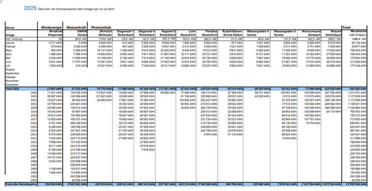 Auf dieser Tabelle sehen Sie die Stromproduktion aller Anlagen,
