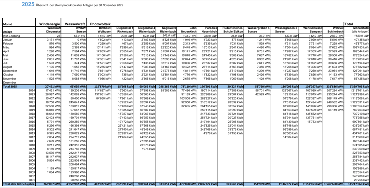Auf dieser Tabelle sehen Sie die Stromproduktion aller Anlagen,