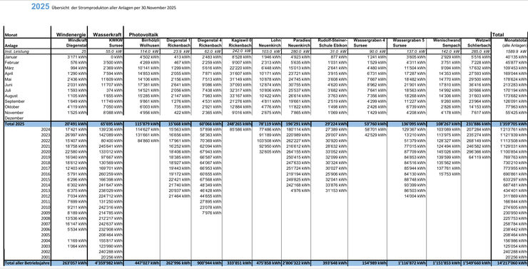 Auf dieser Tabelle sehen Sie die Stromproduktion aller Anlagen, welche durch die GWD realisiert worden sind.